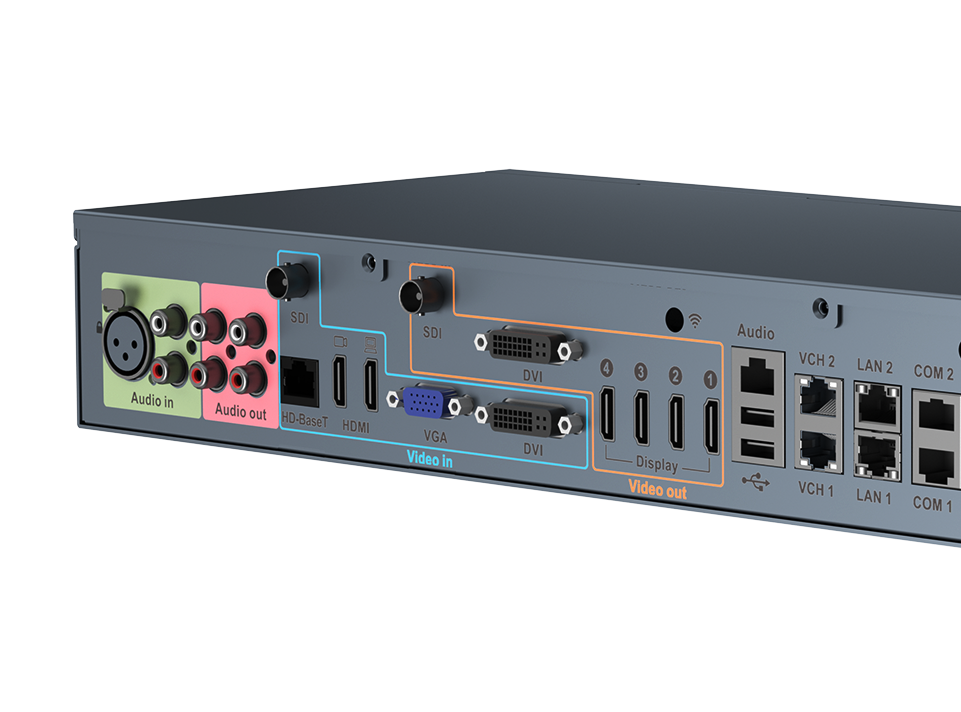 億聯(lián)MeetingEye 900兼容多種音視頻標準接口,在音頻方面支持:RCA,XLR;視頻可支持:HDMI,VGA,HD-BaseT,SDI,DVI;可滿足復雜會議場景中不同設備的接入需求,實現(xiàn)一機多用,高效拓展更多大會場景。